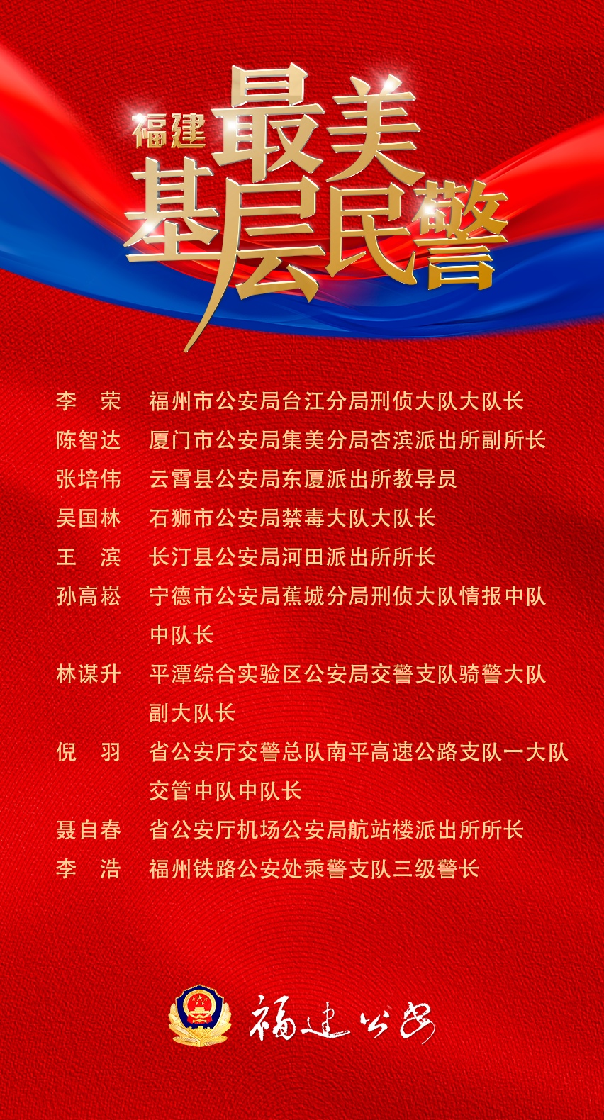 在第六个中国人民警察节即将到来之际,1月5日,2025福建省“最美基层民警”名单公布。根据省委宣传部、省公安厅关于开展2025福建省“最美基层民警”宣传选树活动工作安排,经组织推荐、集中宣传、现场评审,李荣、陈智达、张培伟、吴国林、王滨、孙高崧、林谋升、倪羽、聂自春、李浩等10名民警光荣当选。